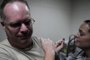 Col. Eric Beene, 39th Air Base Wing commander, receives an influenza vaccination from Staff Sgt. Christie Schlattweiler, 39th Medical Operations Squadron allergy and immunizations technician, Sept. 14, 2010 at Incirlik Air Base, Turkey. This year's vaccination includes both the seasonal flu and H1N1