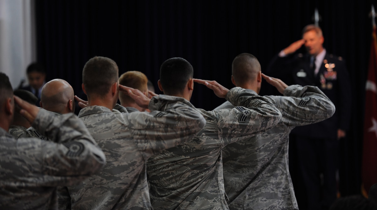 Members of the 39th Operations Squadron render their final salute to Lt. Col. Bryan Wolford, outgoing 39th Operations Squadron commander, during the 39th OS change-of-command ceremony June 19, 2012, at Incirlik Air Base, Turkey. Members of the 39th OS bid farewell to Lt. Col. Bryan Wolford and welcomed Lt. Col. John Vincent as their new squadron commander. (U.S. Air Force photo by Senior Airman Jarvie Z. Wallace/Released)