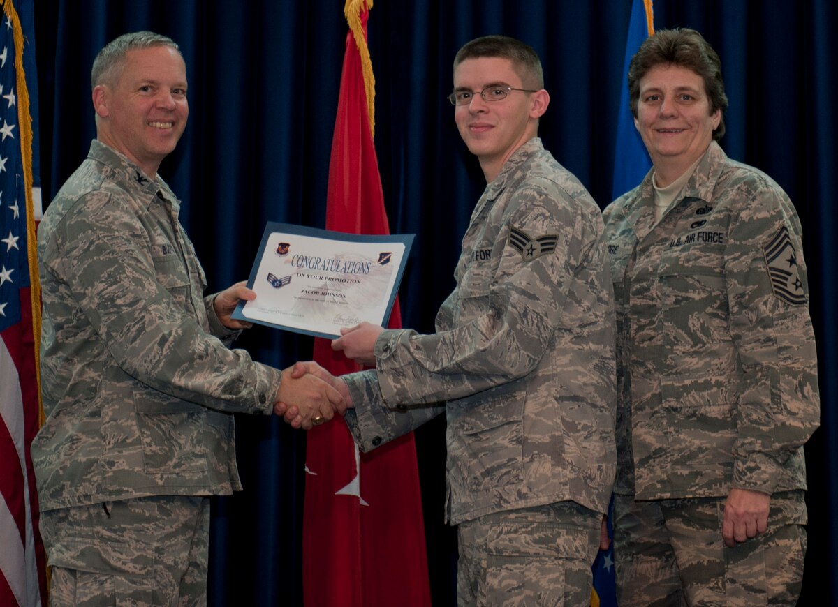 Jacob Johnson, 39th Civil Engineer Squadron, is promoted to the rank of senior airman Dec. 29, 2011, in the Club Complex ballroom at Incirlik Air Base, Turkey. (U.S. Air Force photo by Senior Airman Anthony Sanchelli/Released)